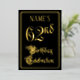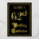 The front of this luxurious, elegant, foil sixty-second birthday party/celebration invitation design features the message “62nd Birthday Celebration” in ornate script-style text. It also features an editable name. The background of the front is colored black by default (although it can be customized to a different color). The back features personalized details about the event, such as the date, time, location, and any other relevant information. Ornate, fancy, editable invitations like these might be used to invite guests to a birthday celebration/party being held to celebrate somebody’s 62nd birthday. [~Z0000589]