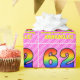 This cheerful and festive 62nd birthday-themed wrapping paper design features a large number "62" having a colorful pattern inspired by the appearance of a rainbow spectrum. It also features the message "Happy 62nd Birthday,", and a personalized name. The background features a light pink and dark pink stripes pattern containing loving pink heart shapes. Wrapping paper like this might be used when giving a gift or present in honor of somebody’s sixty second birthday. [~Z0000415]