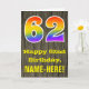 The front of this colorful yet rustic birthday greeting card design features a large number "62" having a rainbow spectrum gradient inspired pattern. It also features the message "Happy 62nd Birthday,", and a customizable recipient name. The front features a background depicting a rustic faux wood grain style pattern. The inside features a personalized birthday greeting message, or could perhaps be cleared and left blank if a message is to be written by hand instead. A custom birthday card like this might be a fun way to send birthday wishes to somebody who is celebrating their sixty second birthday. [~Z0000419]