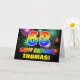 The front of this cheerful, colorful, and fun birthday themed greeting card design features a large number "63" and the message "HAPPY BIRTHDAY,", both colored with a rainbow spectrum gradient inspired pattern, along with a bold yellow personalized recipient name. The front also has a multicolored background pattern inspired by the look of bursting celebratory fireworks. The inside features a customized birthday greeting message, or could perhaps be cleared and left blank if a message is to be written by hand instead. A colorful customizable birthday card like this might be a fun way of celebrating somebody’s sixty third birthday. [~Z0000471]