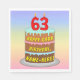 This upbeat and cheerful birthday-themed paper napkin design features a cartoon-style depiction of a three-tier birthday cake having numeral-shaped candles on top showing the number “63“, along with the message “HAPPY 63RD BIRTHDAY,”, and a customizable recipient name. The background features a multi-color pastel rainbow spectrum inspired gradient pattern. Paper napkins like these might be used at a birthday party held in celebration of somebody’s sixty third birthday. [~Z0000623]