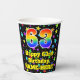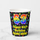 This colorful and joyful birthday-themed paper cup design features a large number “63” with a rainbow spectrum gradient inspired pattern, along with the message “Happy 63rd Birthday,”, and a personalized name. The background features a multicolored pattern featuring many star shapes with different colors and sizes. Vibrant, colorful paper cups like this might be fun to have at a birthday celebration/party being held to honor somebody’s sixty third birthday. [~Z0000540]