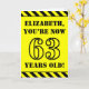 The front of this attention-grabbing and fun birthday-themed greeting card design features a personalized name and the message "YOU’RE NOW 63 YEARS OLD!" in black stencil style text on a yellow colored background. The front also features an eye-catching yellow and black stripes pattern at the top and bottom edges. The inside features a personalized birthday greeting message, or could perhaps be cleared and left blank if a message is to be written by hand instead. A personalized birthday card like this might be a fun way to send birthday wishes to somebody who is celebrating their sixty third birthday. [~Z0000413]