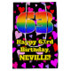 This happy and colorful birthday-themed gift bag design features a large number “63” having a rainbow spectrum gradient inspired pattern. It also features the message “Happy 63rd Birthday,”, and a custom name. The background features a pattern of purple, pink, and red heart shapes of various sizes. A happy birthday themed gift bag like this might be used when giving a gift or present in celebration of somebody’s sixty third birthday. [~Z0000551]