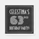 This elegant sixty-third birthday party paper napkin design features an editable name, a fancy art deco style inspired number “63rd”, the message “BIRTHDAY PARTY!”, and a border pattern consisting of lines. The background is colored black by default, but it can be customized to a different color, if desired. Paper napkins like these might be used when celebrating somebody’s sixty third birthday. [~Z0000616]