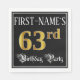 This luxurious and fancy birthday themed paper napkin design features a custom name and the message “63rd Birthday Party”. The large number “63rd” has an imitation/faux gold-inspired coloring pattern, the words “Birthday Party” are in ornate script-style text, and the background is colored black by default (although it can be customized). Elegant, ornate paper napkins like this might be useful at a birthday party being held in celebration of somebody’s sixty third birthday. [~Z0000565]