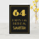 The front of this vintage look birthday themed greeting card design features a large art deco style inspired number "64", the message "HAPPY 64th BIRTHDAY,", a personalized name, and a border pattern consisting of lines. The front also has a black-colored background. The inside features a personalized birthday greeting message, or could perhaps be cleared and left blank if a message is to be written by hand instead. A customizable birthday card like this might be a fun way to send a message in celebration of somebody’s sixty fourth birthday. [~Z0000502]