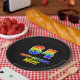 This fun, cheerful, and colorful birthday paper plate design features a large number "64" and the message "HAPPY BIRTHDAY,", both colored with a rainbow spectrum gradient inspired pattern, along with a bold yellow customizable name. It has a black colored background. Fun, editable paper plates like this might be used at a birthday party being held to celebrate somebody’s sixty fourth birthday. [~Z0000488]