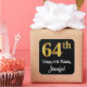 This sophisticated, luxurious, and stylish birthday-themed sticker design features a large ordinal number “64th” having an imitation/faux gold-like look, plus the birthday greeting message “Happy 64th Birthday,” and a customizable name in a script-style font. The background is colored black. Sophisticated birthday themed stickers like this might be used when giving a gift or present in celebration of somebody’s sixty fourth birthday, or perhaps may be handed out to the attendees at a birthday celebration or party. [~Z0000517]
