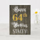 The front of this formal and ornate birthday greeting card design features the message “Happy 64th Birthday,”, and an editable recipient name. Some of the message is in elaborate script-style text. The large number “64th” features a faux/imitation gold-inspired look pattern. The background has a faux/imitation woodgrain-inspired pattern. The inside has a customized birthday greeting message, or could perhaps be cleared and left blank if a message is to be written by hand instead. A luxurious, customized birthday greeting card like this might be sent in celebration of somebody’s sixty-fourth birthday. [~Z0000561]