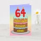 This joyful and upbeat birthday-themed greeting card design features a cartoon-style depiction of a three-tier birthday cake having number-shaped candles on top showing the age “64“, along with the message “HAPPY 64TH BIRTHDAY,”, and a personalized recipient name. The background of the front has a multicolored pastel rainbow spectrum inspired gradient pattern. The inside features a custom birthday greeting message, or could perhaps be cleared and left blank if a message is to be written by hand instead. A fun, customized birthday greeting card like this might be sent in celebration of somebody’s sixty-fourth birthday. [~Z0000625]
