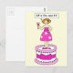 A glamorous cartoon lady standing on a large cake and wearing a strapless pink dress. She is holding a cocktail in one hand and saying '64 is the new 44'.