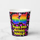 This colorful and fun birthday paper cup design features a large number “64” with a rainbow spectrum gradient inspired pattern, along with the message “Happy 64th Birthday,”, and a customizable name. The background features a pattern of heart shapes with colors like purple, red, and pink. Cheerful, fun paper cups like this might be fun to have at a birthday celebration being held in celebration of somebody’s sixty fourth birthday. [~Z0000548]