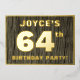 The front of this bold sixty-fourth birthday celebration/party foil invitation card features an editable name, a large number “64th”, the message “BIRTHDAY PARTY!”, and a border, all in foil. The background of the front features a rustic, yet sophisticated, faux wood grain appearance inspired pattern. The back features personalized details about the event, such as the date, time, location/venue, and any other information that may be relevant. Personalized invitations like these might be used to invite guests to a birthday party being held in celebration of somebody’s 64th birthday. [~Z0000598]