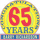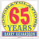 Birthday sticker. Congratulation on celebrating 65 Years. Colourful sticker in red, yellow, and blue. 65 years old.