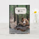 A bear humorously poses with its paws resting on a wooden picnic table in a forest setting for a 65th birthday.