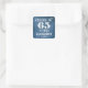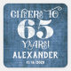 65th birthday favor tag stickers, featuring rustic blue linen burlap charm with chalkboard letters in white and personalized with name and date below.
