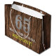 This American Old West inspired and country look birthday-themed gift bag design features a large rustic look number "65", the message "Happy 65th Birthday,", a customizable name, and a faux/imitation wood grain inspired look pattern background. An editable birthday gift bag like this might be a fun way to wrap a gift or present being given to somebody celebrating their sixty-fifth birthday. [~Z0000470]
