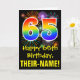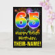 The front of this fun, colorful, and exciting birthday-themed greeting card design features a large number "65" with a rainbow spectrum gradient inspired pattern, along with the message "Happy 65th Birthday,", and a custom recipient name. The front additionally features a colorful background pattern inspired by bursting celebratory fireworks. The inside features a custom birthday greeting message, or could perhaps be cleared and left blank if a message is to be written by hand instead. A customizable birthday card like this might be a fun way to acknowledge somebody’s sixty-fifth birthday. [~Z0000442]