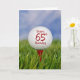 Close up of a white golf ball on a red tee in grass with sky background for 65th birthday.