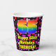 This cheerful and fun birthday-themed paper cup design features a large number “65” with a rainbow spectrum gradient inspired pattern, along with the message “Happy 65th Birthday,”, and a customizable name. The background features a pattern of heart shapes with colors like pink, red, and purple. Upbeat, cheerful paper cups like this might be fun to have at a birthday party/celebration being held to celebrate somebody’s sixty fifth birthday. [~Z0000548]