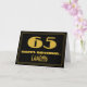 The front of this vintage style and 1920s-1930s style inspired birthday themed greeting card design features a large art deco style inspired number "65", the message "HAPPY BIRTHDAY,", a customizable name, and a border pattern consisting of lines. The background of the front is colored black. The inside features a personalized birthday greeting message, or could perhaps be cleared and left blank if a message is to be written by hand instead. A custom birthday card like this might be a fun way to send birthday wishes to somebody who is celebrating their sixty fifth birthday. [~Z0000506]