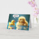 A fluffy duckling and a yellow rubber duck are floating side by side on a calm, shimmering blue surface for a 65th birthday.