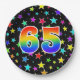 This colorful, fun, and cheerful paper plate design features a large number "65" having a rainbow spectrum gradient inspired pattern coloring. The background features a pattern of colorful star shapes. Fun paper plates like this might be used at a celebration being held to honor somebody’s 65th birthday, or a couple’s 65th anniversary, or some other 65th event. [~Z0000493]