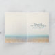 A blank invitation paper with an envelope rests on a sandy beach against the backdrop of gently swaying palm trees and a serene ocean under a vibrant sunset for 65th anniversary.