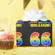 This colorful, cheerful, and fun birthday-themed wrapping paper design features a large number "66" and the message "HAPPY BIRTHDAY,", both having a rainbow spectrum gradient inspired pattern coloring, along with a bold yellow personalized recipient name. The background is colored black. Fun birthday themed wrapping paper like this could be used to wrap a gift or present being given to celebrate somebody’s sixty sixth birthday. [~Z0000475]