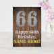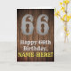 This country look and American Old West inspired birthday themed greeting card design features a large rustic look number "66", the message "Happy 66th Birthday,", a customizable name, and a faux/imitation wood grain inspired look pattern background. The inside has a customizable birthday greeting message, or could perhaps be cleared and left blank if a message is to be written by hand instead. An editable birthday greeting card like this might be sent to celebrate somebody’s sixty-sixth birthday. [~Z0000469]