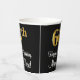 This sophisticated, stylish, and elegant birthday themed paper cup design features a large ordinal number “66th” having an imitation/faux gold-inspired look, in addition to the birthday greeting message “Happy 66th Birthday,” and a customizable name in a script-style font. The background is colored black. Luxurious paper cups like this might be used when hosting a birthday party for somebody in celebration of their sixty sixth birthday. [~Z0000538]