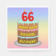 This upbeat and fun birthday paper napkin design features a cartoon-style depiction of a three-tier birthday cake having numeral-shaped candles on top showing the number “66“, along with the message “HAPPY 66TH BIRTHDAY,”, and a customizable recipient name. The background features a multi-color pastel rainbow spectrum inspired gradient pattern. Paper napkins like these might be used when celebrating somebody’s sixty sixth birthday. [~Z0000623]