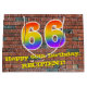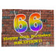 This vibrant and fun birthday gift bag design, inspired by graffiti and street art, features a large number "66" with a rainbow spectrum gradient inspired pattern, along with the message "Happy 66th Birthday,", and a personalized name. The background features a brick wall style pattern. A colorful birthday themed gift-bag like this might be a fun way to wrap a gift or present being given to celebrate somebody’s 66th birthday. [~Z0000522]