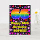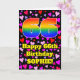 The front of this cheerful and joyful birthday themed greeting card design features a large number “66” with a rainbow spectrum gradient inspired pattern, along with the message “Happy 66th Birthday,”, and a personalized name. The background of the front features a pattern of purple, pink, and red heart shapes. The inside has a customizable birthday greeting message, or could perhaps be cleared and left blank if a message is to be written by hand instead. A cheerful, editable birthday greeting card like this might be a fun way to send birthday greetings to somebody who is celebrating their sixty-sixth birthday. [~Z0000551]