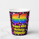 This fun and happy birthday-themed paper cup design features a large number “66” having a rainbow spectrum gradient inspired pattern. It also features the message “Happy 66th Birthday,”, and an editable name. The background features a pattern of heart shapes with colors like pink, purple, and red. Joyful, happy paper cups like this might be fun to use at a birthday party being held to celebrate somebody’s 66th birthday. [~Z0000548]