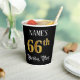 This elegant and ornate birthday paper cup design features a custom name and the message “66th Birthday Party”. The large number “66th” has a faux/imitation gold-inspired coloring pattern, and the words “Birthday Party” are in opulent script-style text. The background is colored black by default (although it can be customized). Luxurious, fancy paper cups like this might be used at a birthday party/celebration being held in celebration of somebody’s sixty sixth birthday. [~Z0000567]