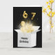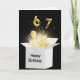 Gold balloons and sparkling light beams glow in a white box on black background for 67th birthday
