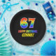 This cheerful, colorful, and fun birthday themed paper plate design features a large number "67" and the message "HAPPY BIRTHDAY,", both having a rainbow spectrum gradient inspired pattern coloring, along with a bold yellow personalized name. It has a black colored background. Fun, personalized paper plates like this might be used at a birthday celebration being held in honor of somebody’s 67th birthday. [~Z0000488]