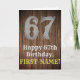 This American Old West look and country look birthday greeting card design features a large rustic look number "67", the message "Happy 67th Birthday,", an editable name, and a faux/imitation wood grain inspired look pattern background. The inside has a custom birthday greeting message, or could perhaps be cleared and left blank if a message is to be written by hand instead. A customizable birthday greeting card like this might be a fun way to send a birthday greeting message to somebody who is celebrating their sixty-seventh birthday. [~Z0000469]