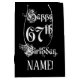This elaborate and elegant birthday themed giftbag design features the message “Happy 67th Birthday,” in opulent script style text, on a black colored background. It also features a personalized recipient name. A birthday themed gift-bag like this might be a respectable way to wrap a gift or present being given to celebrate somebody’s sixty seventh birthday. [~Z0000557]