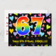The front of this colorful, fun, and loving birthday postcard design features a large number "67" with a rainbow spectrum gradient inspired pattern, along with the message "Happy 67th Birthday,", and a customizable recipient name. The front additionally has a colorful and vibrant background pattern featuring loving hearts of different sizes. The back features a customizable birthday greeting message, or could perhaps be cleared and left blank if a message is to be written by hand instead. A customizable birthday postcard like this might be a fun way to send a message celebrating somebody’s sixty seventh birthday. Postcards like this might also be used to invite guests to a birthday celebration being held for somebody who is turning 67 years old. [~Z0000448]