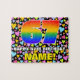 This bold and exciting birthday-themed jigsaw puzzle design features a large number “67” having a multicolored rainbow spectrum inspired gradient pattern. It also features the message “HAPPY 67th BIRTHDAY,”, and a customizable recipient name. The background features a cheerful pattern of heart shapes having various colors and sizes. A colorful, editable birthday puzzle like this might be given in celebration of somebody’s sixty-seventh birthday. [~Z0000611]