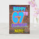 The front of this fun birthday-themed greeting card design features the message “HAPPY 67TH BIRTHDAY,” having a colorful, vibrant, graffiti-inspired appearance, plus a personalized recipient name. The background of the front features a pattern inspired by the look of a brick wall. The inside has an editable birthday greeting message, or could perhaps be cleared and left blank if a message is to be written by hand instead. A fun, customizable birthday greeting card like this might be used to acknowledge somebody’s sixty-seventh birthday. [~Z0000531]