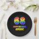 This colorful, fun, and cheerful birthday paper plate design features a large number "68" and the message "HAPPY BIRTHDAY,", both colored with a rainbow spectrum gradient inspired pattern, along with a bold yellow editable name. The background is colored black. Fun, customized paper plates like this might be used at a celebration being held to honor somebody’s sixty eighth birthday. [~Z0000488]