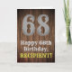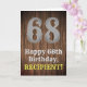 This country look and American Wild West inspired birthday greeting card design features a large rustic look number "68", the message "Happy 68th Birthday,", a personalized name, and a faux/imitation wood grain inspired look pattern background. The inside has a customized birthday greeting message, or could perhaps be cleared and left blank if a message is to be written by hand instead. An editable birthday greeting card like this might be used to acknowledge somebody’s sixty-eighth birthday. [~Z0000469]