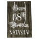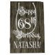 This lavish and elaborate birthday themed giftbag design features the message “Happy 68th Birthday,” in opulent script style text, on a faux wood look inspired pattern background. It also features a custom recipient name. A birthday themed gift bag like this might be a respectable way to wrap a gift or present being given to celebrate somebody’s 68th birthday. [~Z0000558]
