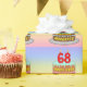 This joyful and colorful birthday wrapping paper design features a cartoon-style depiction of a three-tier birthday cake having number-shaped candles on top showing the age “68“, along with the message “HAPPY 68TH BIRTHDAY,”, and a customizable recipient name. The background has a multicolored pastel rainbow spectrum inspired gradient pattern. Fun wrapping paper like this might be used when wrapping presents being given to somebody in celebration of their 68th birthday. [~Z0000622]