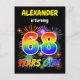 The front of this fun and vibrant birthday party invitation postcard design has a customizable name, an exciting bursting celebratory fireworks inspired pattern, and the message "68 YEARS OLD!" having a colorful rainbow spectrum inspired gradient pattern. The back features an editable message that could describe when and where the party is being held, in addition to other relevant information. Invitation postcards like this might be sent to potential guests of a party being held to celebrate the birthday of somebody who is turning 68 years old. [~Z0000452]