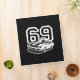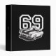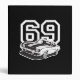 A bold black and white Camaro design sits in front of a white number 69 telling the world you are a fan of this classic American muscle car.